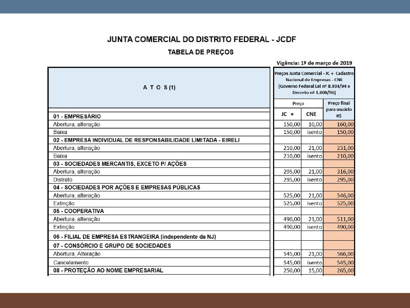 JUNTA COMERCIAL DO DISTRITO FEDERAL – DIVULGA TABELA DE PREÇOS 2019